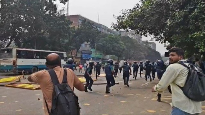 গাড়ি ভাঙচুর করার সময় পুলিশ সদস্যরা আন্দোলনকারীদের ধাওয়া দিলে তারা পুলিশকে লক্ষ্য করে ইট-পাটকেল নিক্ষেপ করেন। এ সময় পুলিশ তাদের লক্ষ্য করে টিয়ারশেল নিক্ষেপ করে। বর্তমানে দুই পক্ষের মধ্যে ধাওয়া-পাল্টা ধাওয়া চলছে। পুলিশকে লাঠিচার্জ করতে দেখা গেছে।