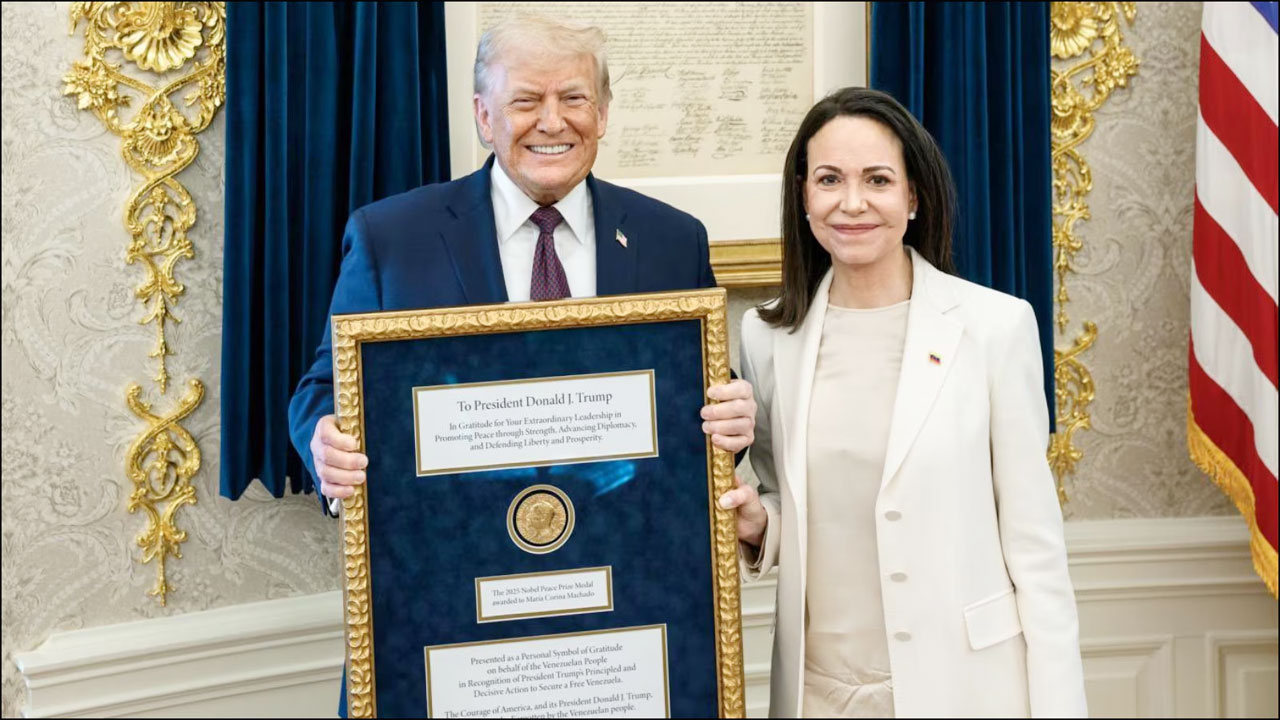 ভেনেজুয়েলার ভিন্ন মতাবলম্বী রাজনীতিবিদ এবং ২০২৫ সালে শান্তিতে নোবেলজয়ী মারিয়া কোরিনা মাচাদো যুক্তরাষ্ট্রের প্রেসিডেন্ট ডোনাল্ড ট্রাম্পকে উপহার হিসেবে নিজের নোবেল পুরস্কারের পদক তুলে দিয়েছেন। গতকাল যুক্তরাষ্ট্রে ট্রাম্পের সঙ্গে সাক্ষাতের সময় এ উপহার প্রদান করেছেন তিনি।