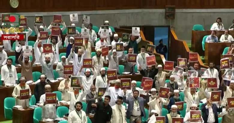 এসময় জামায়াতের নেতৃত্বাধীন বিরোধীদলীয় সংসদ সদস্যরা ‘জুলাইয়ের সঙ্গে বিশ্বাসঘাতকতা বন্ধ কর’ লেখা সম্বলিত প্ল্যাকার্ড প্রদর্শন করেন।